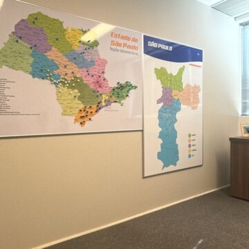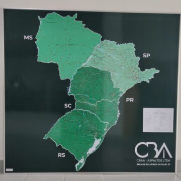 foto de um escritório comercial com um mapa emoldurado com moldura de alumínio contendo os estados do mato grosso do sul, são paulo, paraná e santa catarina, portos, ferrovias e rodovias
